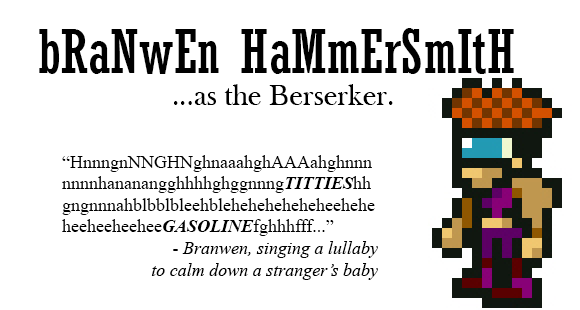 Full Name: BRAAAAAAANWEEEEEEN HAAAAAMMMEEEEERRSMIIIIIIIIITH Aliases: Cap’n Branwen, Branny[Liv-exclusive], the Terror of Warsaw[Context unknown] D&D Alignment: Chaotic Neutral Age: 19 at the start of The Mad Elf Birthday: …she forgot. Race: Dwarven Gender: Female Orientation: “GIRL HOT” Relationship Status: “It’s complicated” with Noelle Family: Oompus Hammersmith (father), Liza Cloudbreaker-Hammersmith (mother), Meat Hammersmith (brother) Favorite Weapon: Bare hands Fighting style:This. Favorite Food: Hubcaps Favorite Music: The screaming in her ears at all times, sea shanties Likes: Adventure, tits, tit adventures Dislikes: Reality, the French, “Anubis” (the safeword that temporarily stops her hallucinations) Greatest Fear: First, look me in the eye and tell me, truthfully, that you want to hear the answer to this question. “If I were an animal, I’d be…”: Sentient roadkill.