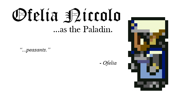 Ofelia is the rightful heir to a fallen province-kingdom. Despite her snobbish attitude and overall crankiness, the person whom she treats the harshest is herself. Her father committed genocide against Rosencrace’s Mystics; as the last surviving member of the Niccolo bloodline, the onus falls on her to pay her father’s debt of sin.