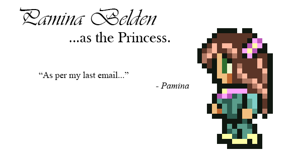 Full Name: Her Blessed Imperial Candescence the Crown Princess Pamina O’Connell Belden IV Aliases: Pammy[Liv-exclusive] D&D Alignment: Lawful Neutral Age: 19 at the start of The Mad Elf Birthday: July 12th Race: Celsioran (Not Elvish or Dwarven) Gender: Female Orientation: Straight Relationship Status: Engaged to Noah Family: Aleister O’Connell (former legal guardian), Queen Stella Belden (mother – deceased), Royal Consort Thaddeus Schittelbricke Belden (father – deceased) Favorite Weapon: Political sanctions & white magic Fighting style: Regimancy, a.ka. legislative magic. (For example, she can cast spells that literally make it illegal for her enemies to move.) Favorite Food: Spaghetti carbonara Favorite Music: Smooth jazz, R&B Likes: Noah, pantsuits, taking a nuanced approach to problems, butterflies, attending charity events, fan mail from children, singing Dislikes: Anarchists, the Koscheis, crime, body odor, pickles, alcohol Greatest Fear: [CLASSIFIED] “If I were an animal, I’d be…”: A fluffy white cat that smells like warm laundry.