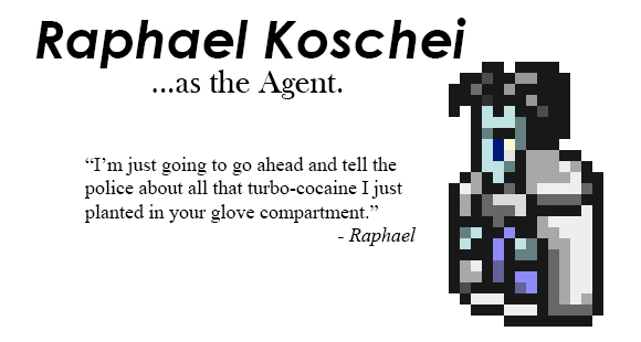 Full Name: Prince Raphael Percival Koschei Aliases: The Hero of Luminar D&D Alignment: Lawful Evil Age: A little over 500 years old Birthday: January 31st Race: Celsioran (not Elvish or Dwarven) Gender: Male Orientation: Straight Relationship Status: Currently single, judging by the amount of brooding into the horizon. Family: “House Koschei is not incestuous. That being said, the classified details of our family tree are none of your business.” Favorite Weapons: Stun baton, dart pistol, syringes, magical disguise kit. Fighting Style: Stealth & nonlethal combat. Favorite Food: Gin & Tonic Favorite Music: “Music is a distraction; next question.” Likes: The smell of a woman’s hair, silence, the status quo, little boys saying they want to be just like him, his father’s rare moments of genuine compassion. Dislikes: Elves, religion, mollycoddling, attempts to change the world, idiocy, jokes, sexual immodesty. Greatest Fear: Astrid on a bad day. “If I were an animal, I’d be…”: “I have neither the ability, need, nor desire to change into an animal. This discussion is pointless, and you are a dishonorable cretin for wasting my time with it. Get out of my sight.“